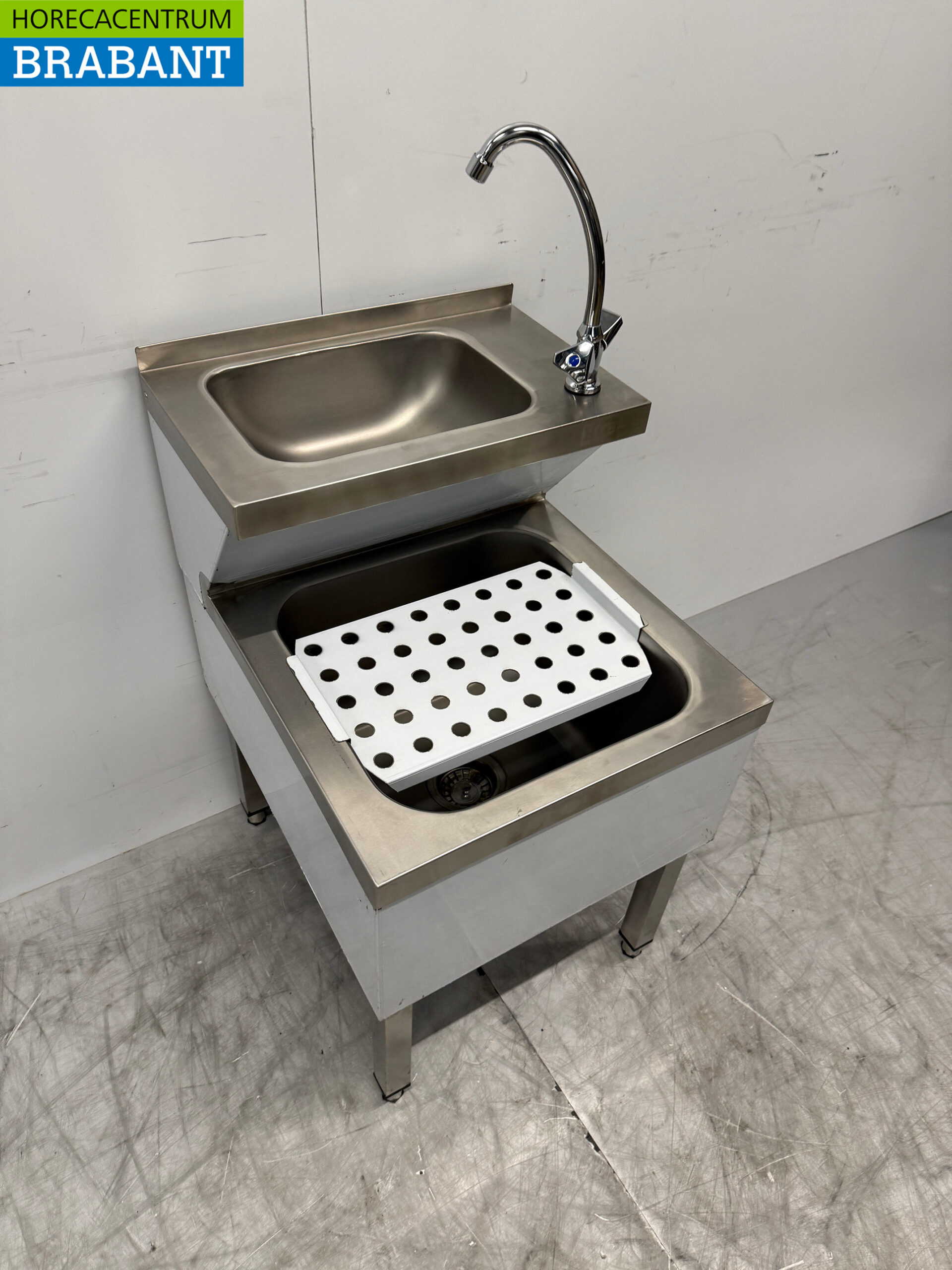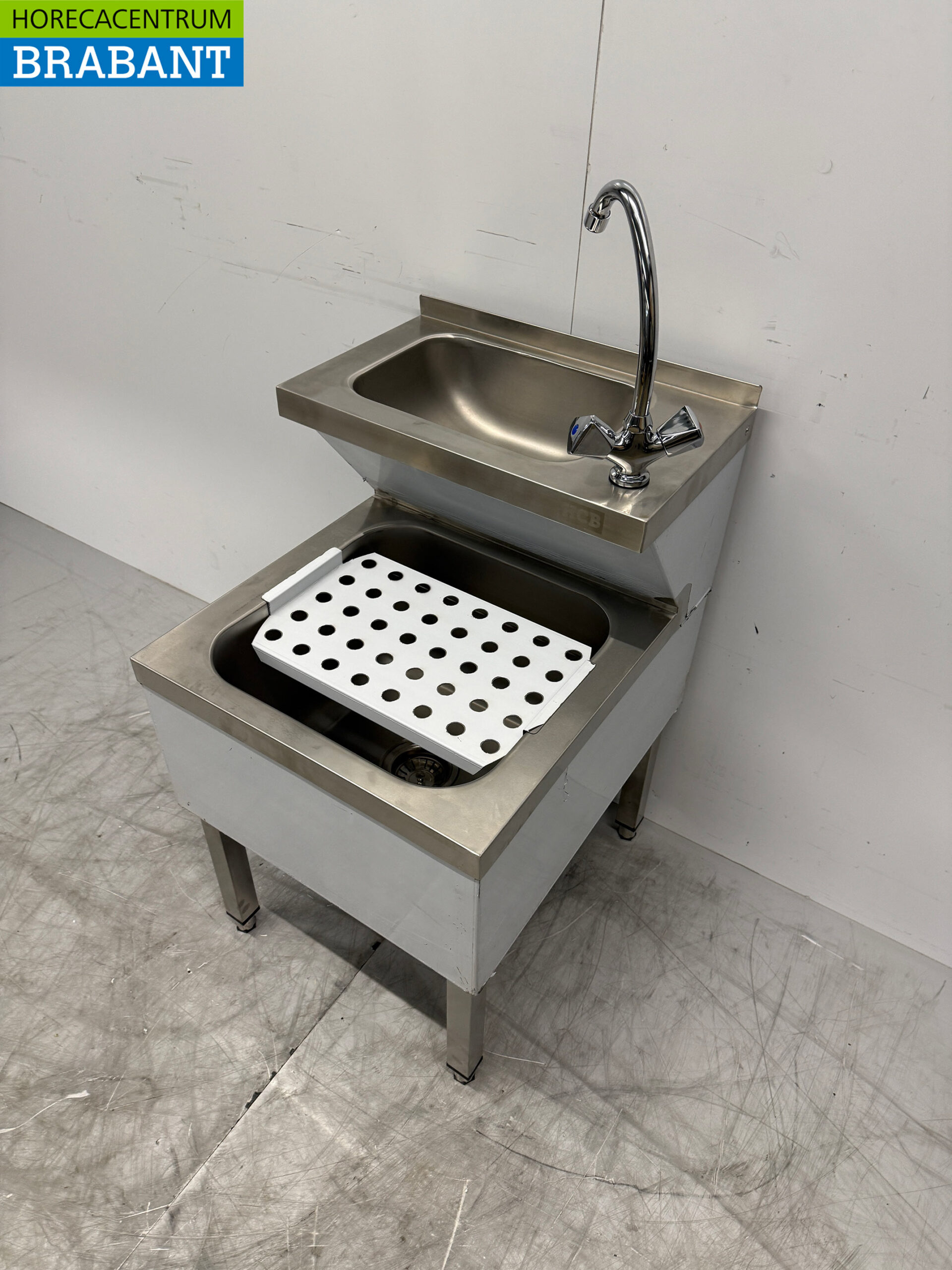 The HCB stainless steel double sink is a practical and durable solution for any professional kitchen or washroom. This combination sink features both a hand wash basin and a pour-out basin, and comes complete with mixer tap. Thanks to the high-quality stainless steel, the sink is hygienic, easy to clean and resistant to intensive use.