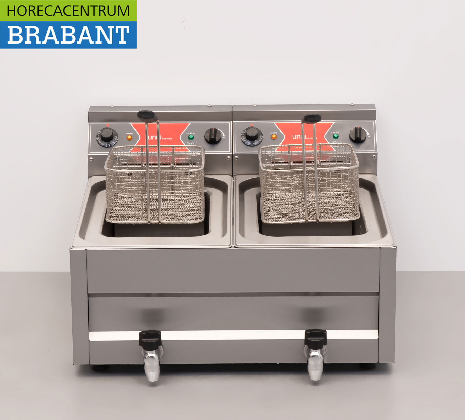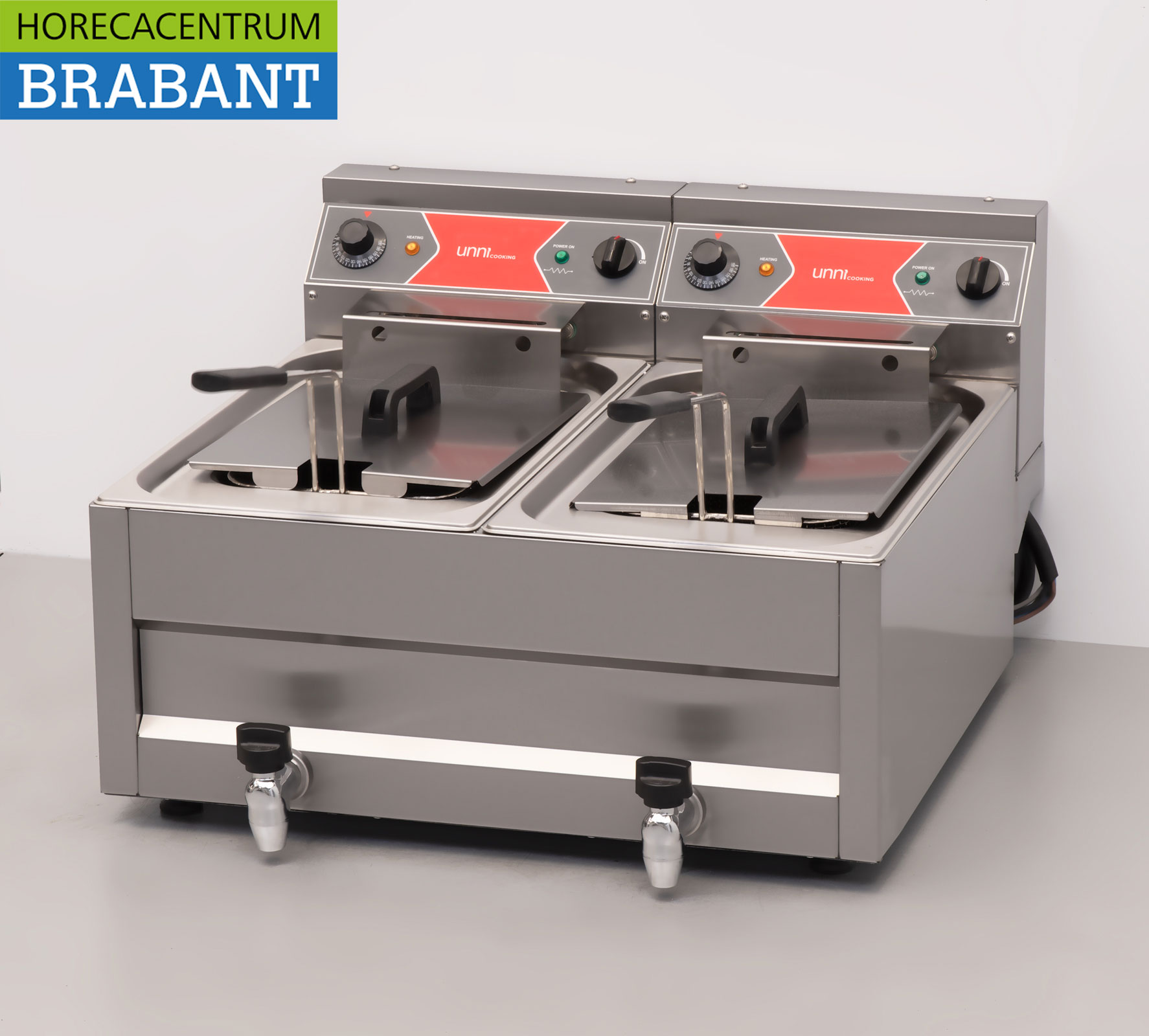 The unit comes with two full frying baskets and two lids. Thanks to the integrated drain valves, changing oil is easy and hygienic. Ideal for catering establishments with a high production capacity.