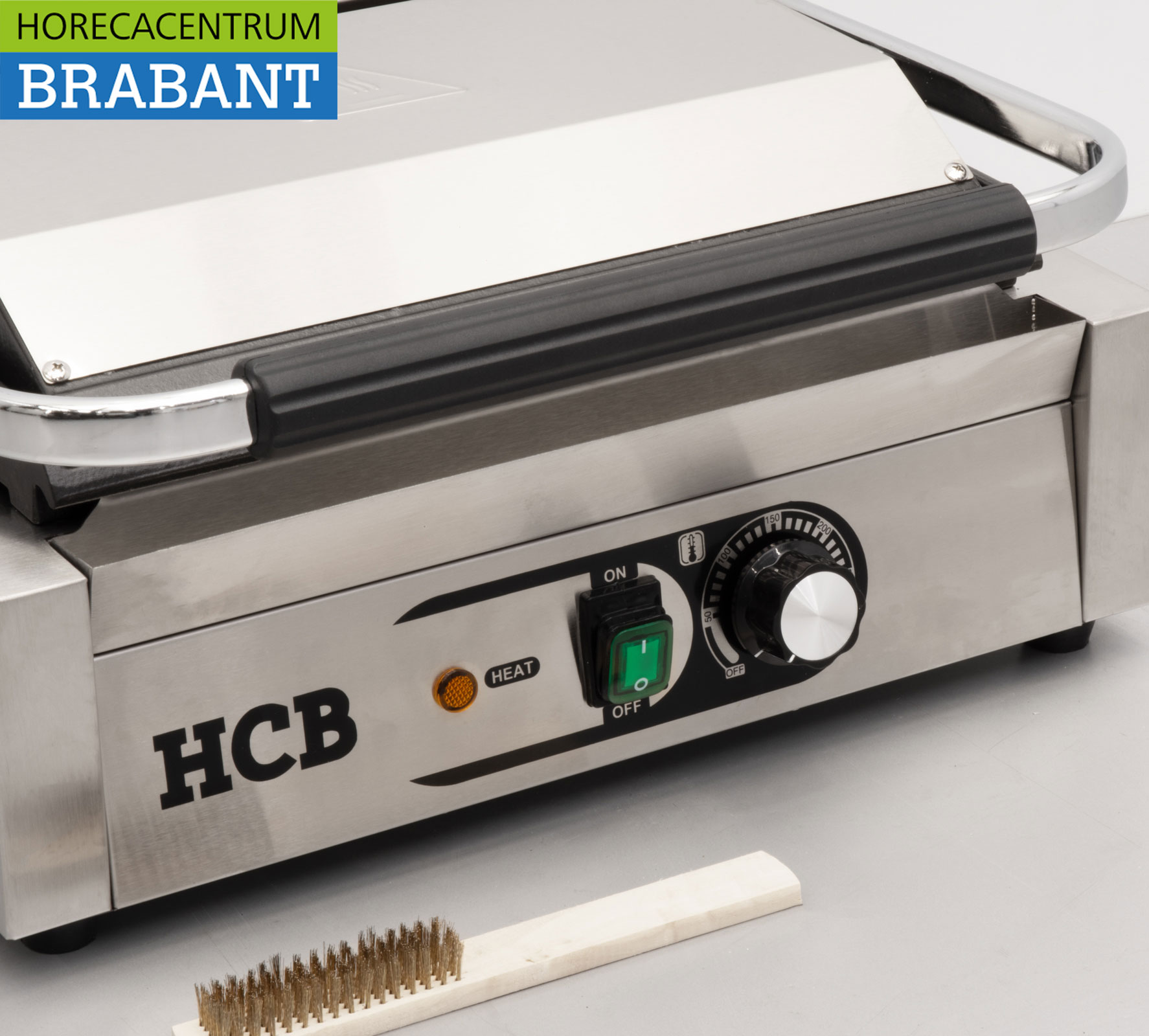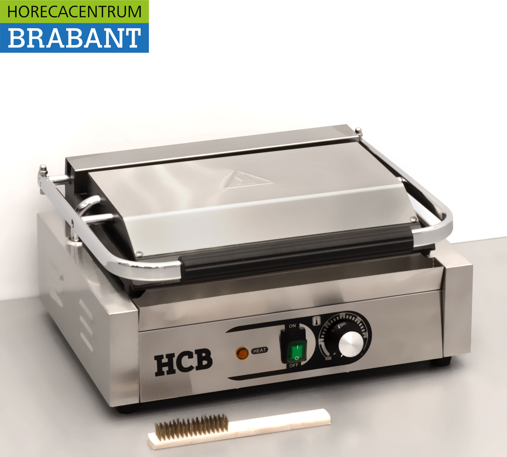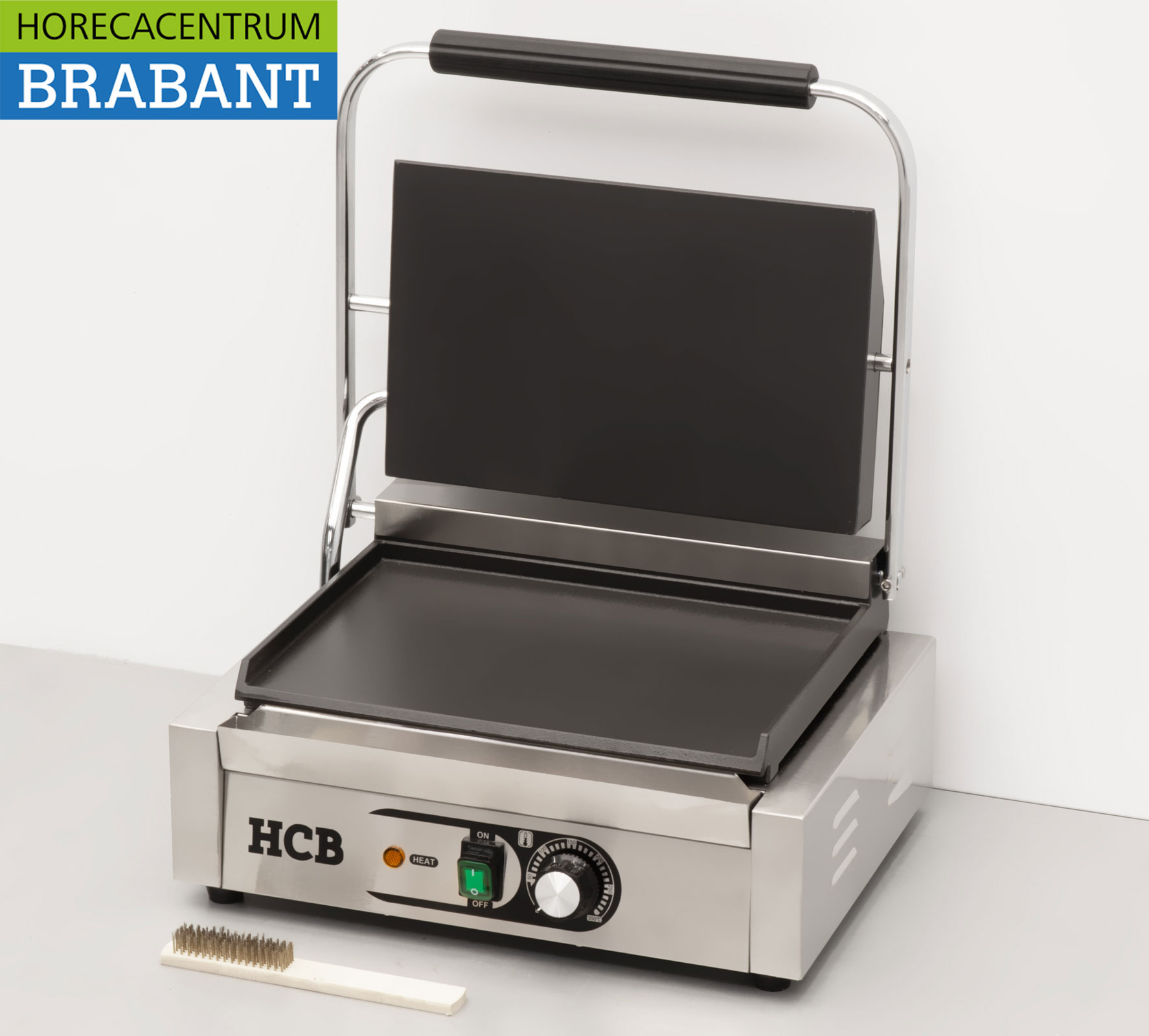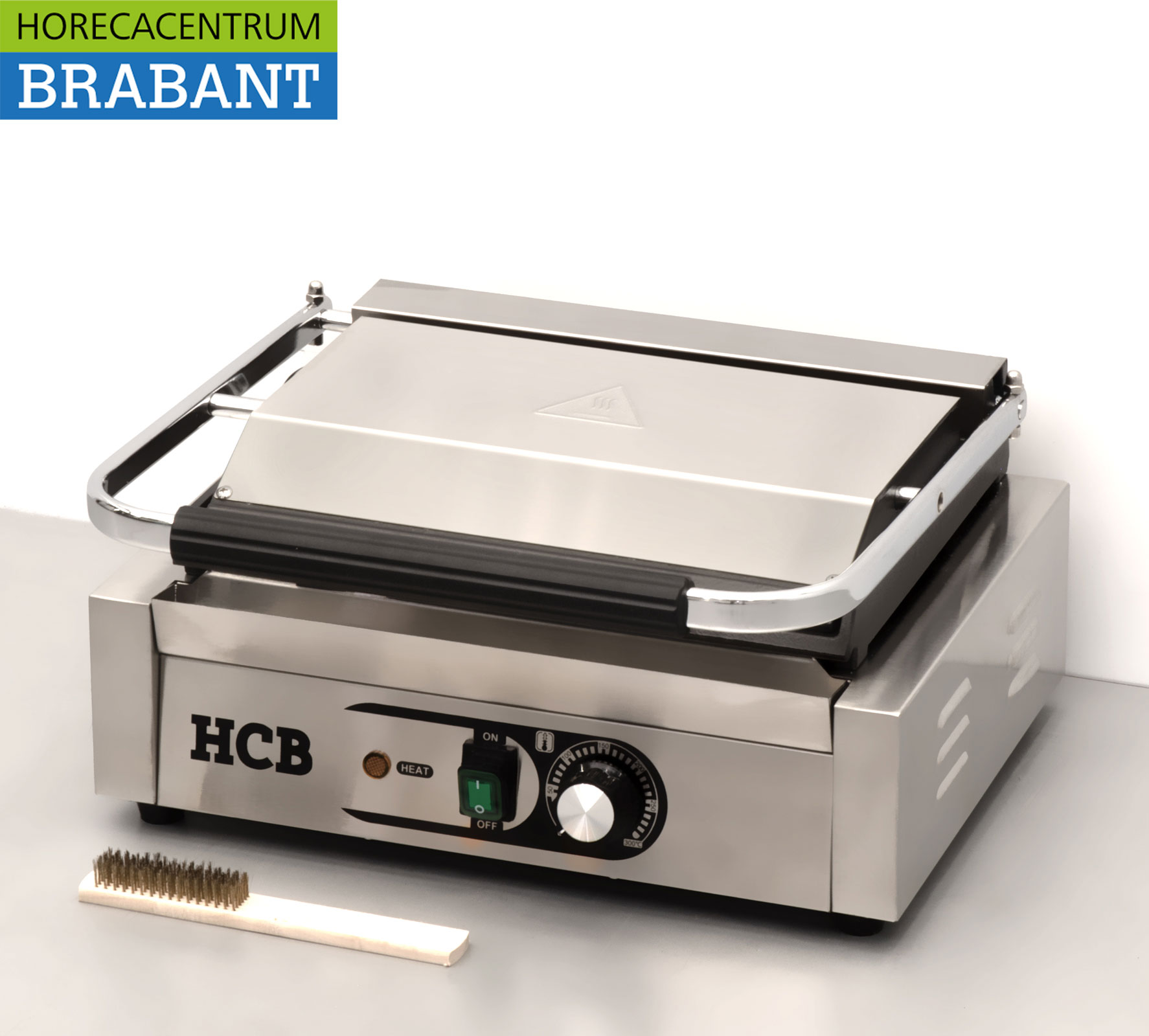 Compact and powerful stainless steel contact grill from HCB, ideal for paninis, sandwiches, meat and vegetables. The double smooth plates (top and bottom) ensure even heat distribution and perfect grilling results. Suitable for daily use in catering environments.